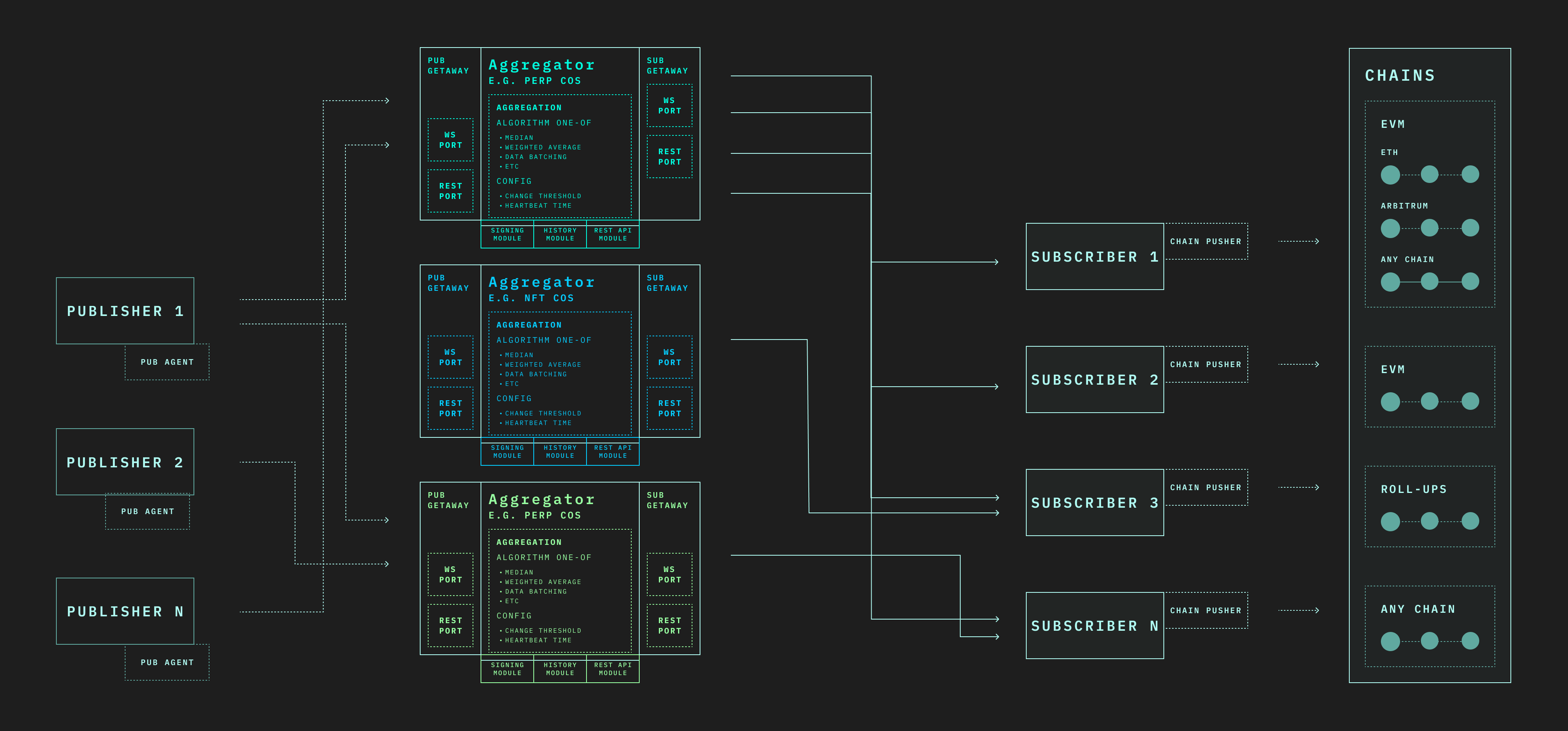 * Aggregators listen to streams of Publisher data via websocket, aggregate and sign those streams, then push the aggregated data streams to Subscribers.